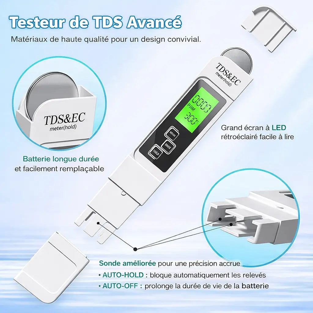 Testeur professionnel TDS (Total des Solides Dissous), EC (Conductivité Électrique), température (°C) et température (°F). Doté d'un grand écran LCD rétroéclairé d'une fonction de verrouillage automatique pour une utilisation simplifiée,